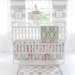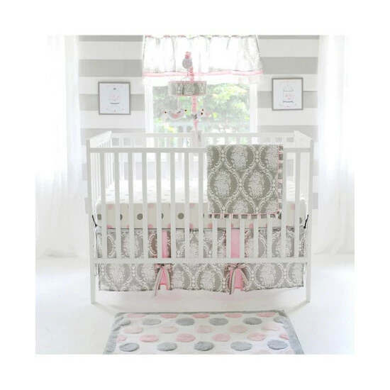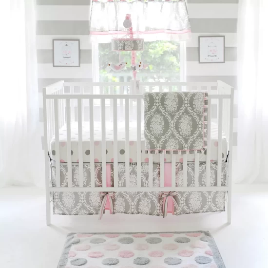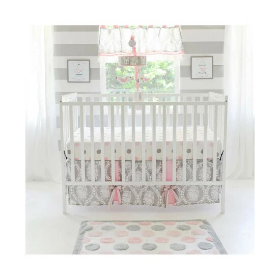 The 15 inch tailored crib skirt features a gray damask pattern with polka dot panels and soft pink bows. The fitted crib sheet consists of playful pink and gray polka dots. The blanket measures 36 x 42 inches with a gray damask pattern.