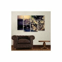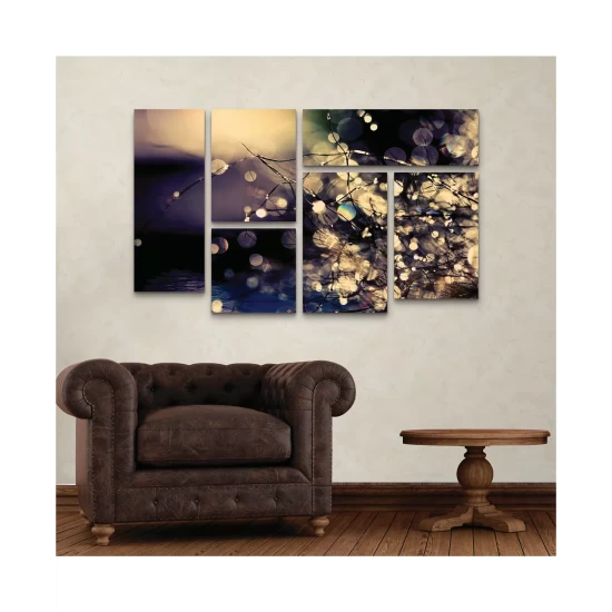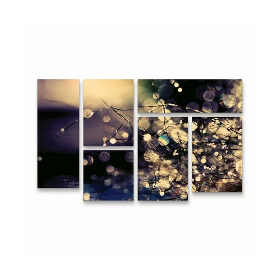 This ready to hang, gallery-wrapped multi panel canvas art set features a photograph of rain drops on branches. Gallery-wrap is a method of wrapping an artist’s canvas around a hidden, wooden frame allowing for a frameless presentation.