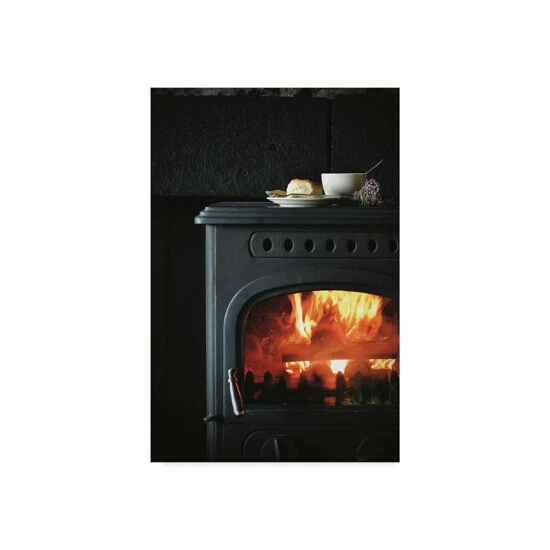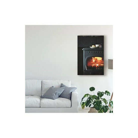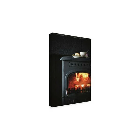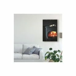 This ready to hang, gallery-wrapped art piece features an open wood-burning stove. Gallery-wrap is a method of wrapping an artist’s canvas around a hidden, wooden frame allowing for a frameless presentation.