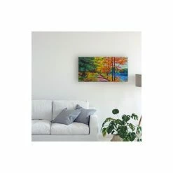 This ready to hang, gallery-wrapped art piece features a dirt path through colorful autumn trees beside a bright lake. Gallery-wrap is a method of wrapping an artist’s canvas around a hidden, wooden frame allowing for a frameless presentation.