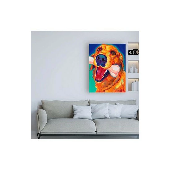 This ready to hang, gallery-wrapped art piece features a vibrant and colorful pop art piece of a golden retriever and bone. Gallery-wrap is a method of wrapping an artist’s canvas around a hidden, wooden frame allowing for a frameless presentation.