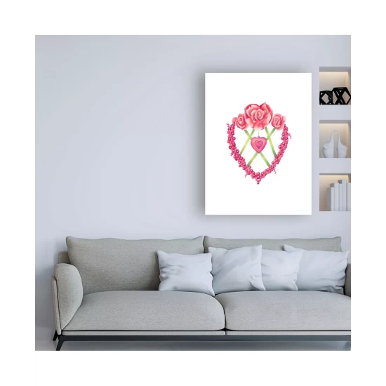 This ready to hang, gallery-wrapped art piece features pink roses and hearts in the overall shape of a heart. Gallery-wrap is a method of wrapping an artist’s canvas around a hidden, wooden frame allowing for a frameless presentation.