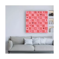 This ready to hang, gallery-wrapped art piece features a pink and red checkerboard patterned collage of hearts. Gallery-wrap is a method of wrapping an artist’s canvas around a hidden, wooden frame allowing for a frameless presentation.