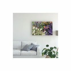 This ready to hang, gallery-wrapped art piece features a butterfly resting on small white flowers. Gallery-wrap is a method of wrapping an artist’s canvas around a hidden, wooden frame allowing for a frameless presentation.