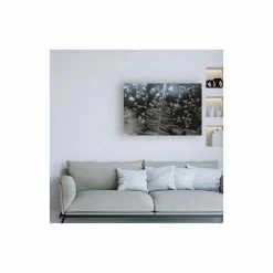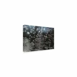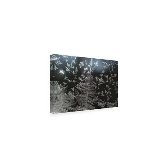 This ready to hang, gallery-wrapped art piece features a black and white photograph of frost patterns on a glass. Gallery-wrap is a method of wrapping an artist’s canvas around a hidden, wooden frame allowing for a frameless presentation.