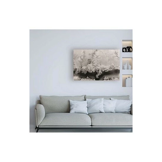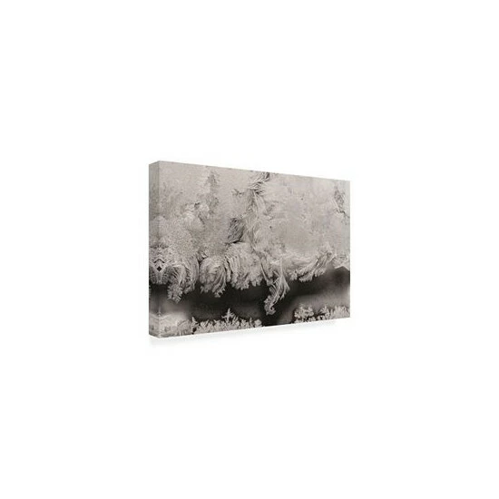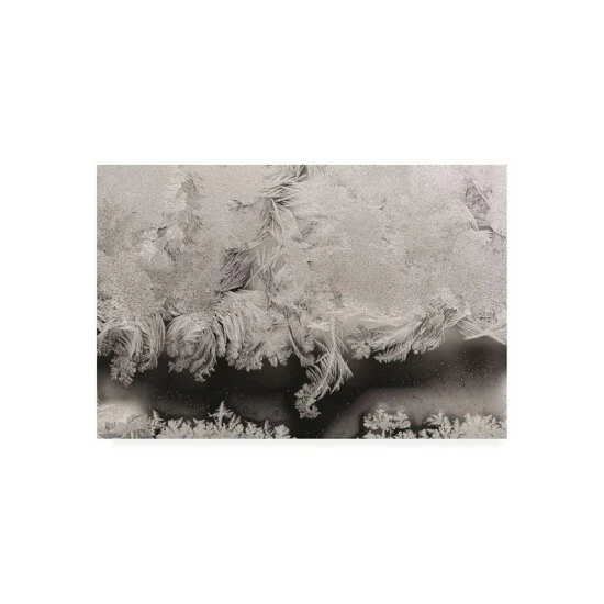 This ready to hang, gallery-wrapped art piece features a black and white photograph of frost patterns on a glass. Gallery-wrap is a method of wrapping an artist’s canvas around a hidden, wooden frame allowing for a frameless presentation.