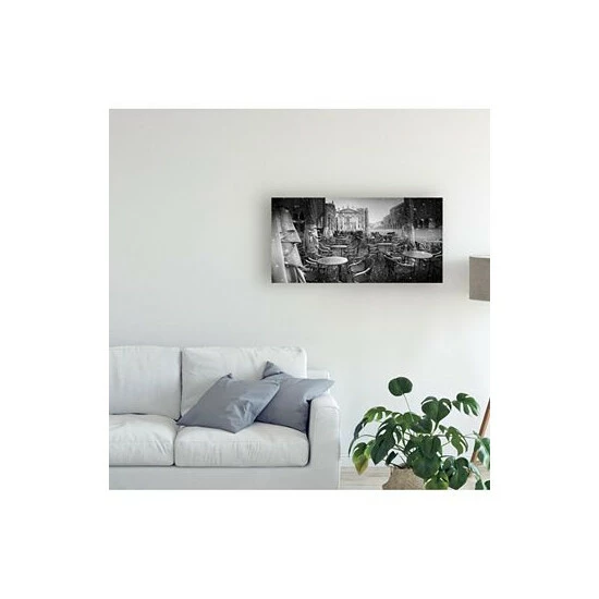 This ready to hang, gallery-wrapped art piece features metal tables sitting outside of a restaurant. Gallery-wrap is a method of wrapping an artist’s canvas around a hidden, wooden frame allowing for a frameless presentation.