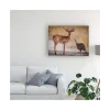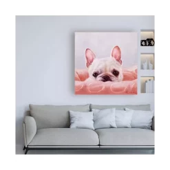 This ready to hang, gallery-wrapped art piece features a white dog hiding behind its bed. Gallery-wrap is a method of wrapping an artist’s canvas around a hidden, wooden frame allowing for a frameless presentation.
