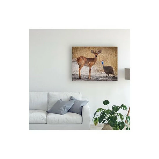 This ready to hang, gallery-wrapped art piece features an antelope standing next to a bird. Gallery-wrap is a method of wrapping an artist’s canvas around a hidden, wooden frame allowing for a frameless presentation.