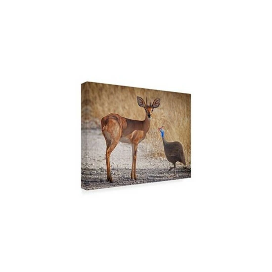 This ready to hang, gallery-wrapped art piece features an antelope standing next to a bird. Gallery-wrap is a method of wrapping an artist’s canvas around a hidden, wooden frame allowing for a frameless presentation.