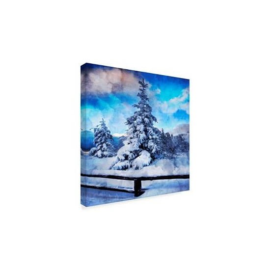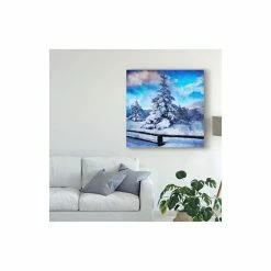 This ready to hang, gallery-wrapped art piece features a tall tree covered in snow under a blue sky. Gallery-wrap is a method of wrapping an artist’s canvas around a hidden, wooden frame allowing for a frameless presentation.